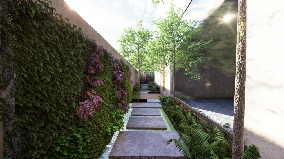 Este diseño suaviza las líneas rectas y la contundencia arquitectónica mediante la incorporación de vegetación y elementos naturales. El acceso peatonal adquiere protagonismo gracias a la creación de puntos focales estratégicos que orientan al visitante y enriquecen la experiencia de llegada. El resultado es un ingreso que combina elegancia, naturalidad y calidez.